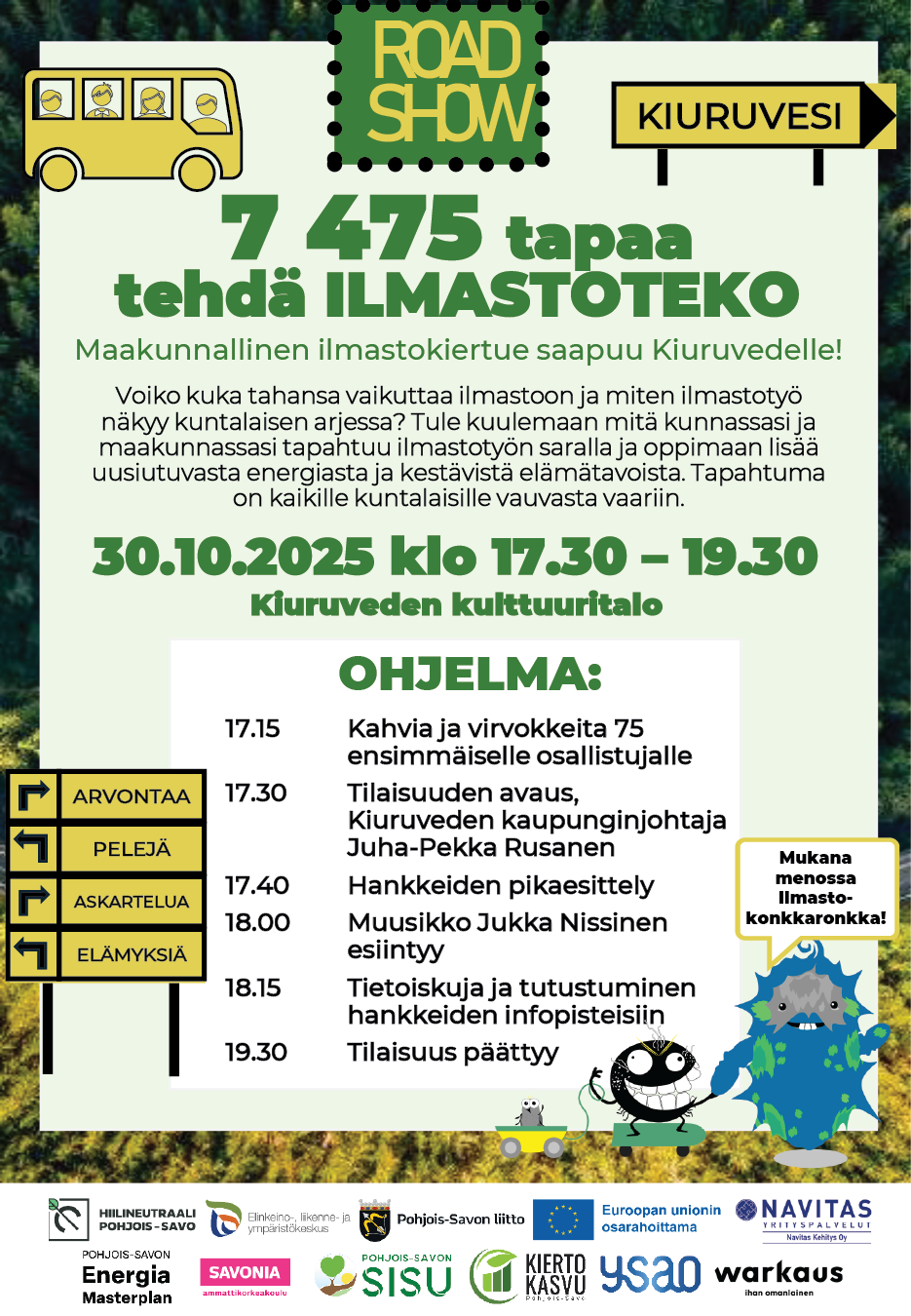 Pohjois-Savossa on käynnissä useita maakunnallisia ilmasto- ja uusiutuvan energian hankkeita. Nyt hankkeet jalkautuvat neljään kuntaan keskustelemaan ja jakamaan tietoa alueellisesta ja ilmastotyöstä kaikille kuntalaisille suunnatuissa iltatapahtumissa. Luvassa ei ole perinteisiä hanke-esittelyjä ja tietoiskuja, vaan mukavaa toimintaa muun muassa kulttuurielämyksiä, pelejä, askartelua, tuulivoimavideoita ja arvontaa – pullakahveja unohtamatta. Tule piipahtamaan, vietetään mukava syysilta kestävien elämäntapojen äärellä!