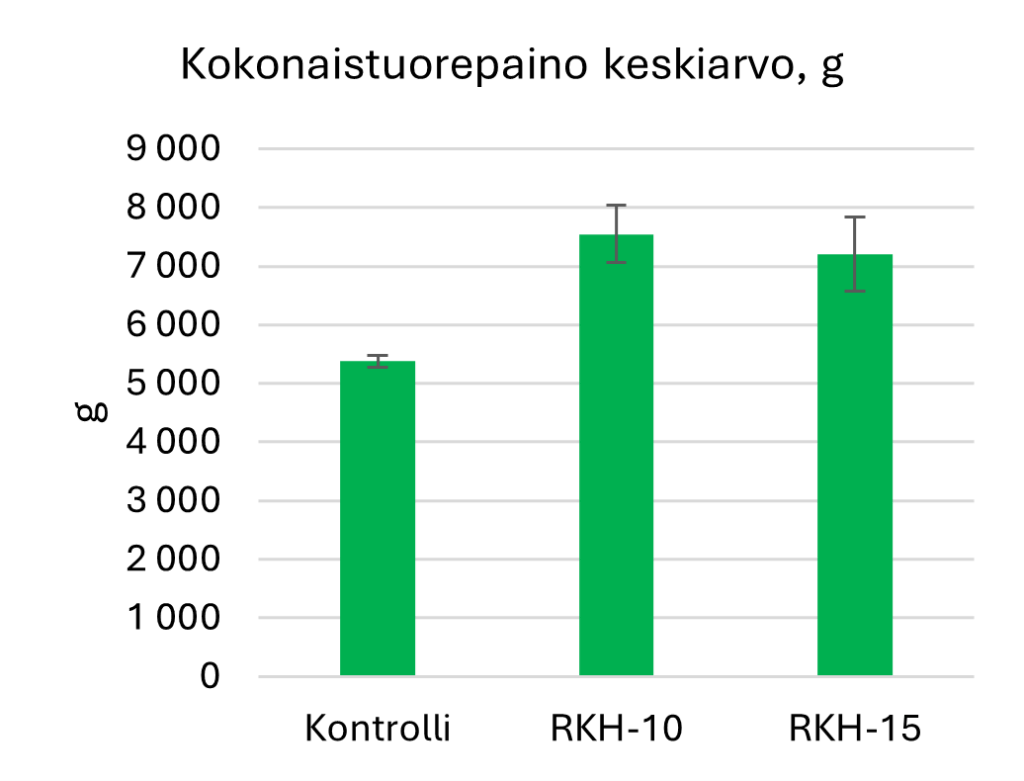 Kesän 2024 aikana kerättyjen satojen tuorepainoista (kuva 1 ja 2) nähdään, että ensimmäinen sato molemmissa rikastushiekkasarjoissa oli hieman pienempi, kuin toinen sato. Kontrolliruuduista kerätty sato tuorepainon osalta jäi selkeästi pienemmäksi kuin RKH-10 ja RKH-15 ruuduista kerätyt sadot, molempien satojen osalta. Suurin 1. ja 2. sato saatiin RKH-10 ruuduista ja näin ollen myös suurin kokonaissato saatiin RKH-10 ruuduista. Tuloksista on myös huomattavissa se, että satojen keskihajonta sarjan rinnakkaisten ruutujen välillä kasvoi rikastushiekkapitoisuuden kasvaessa.