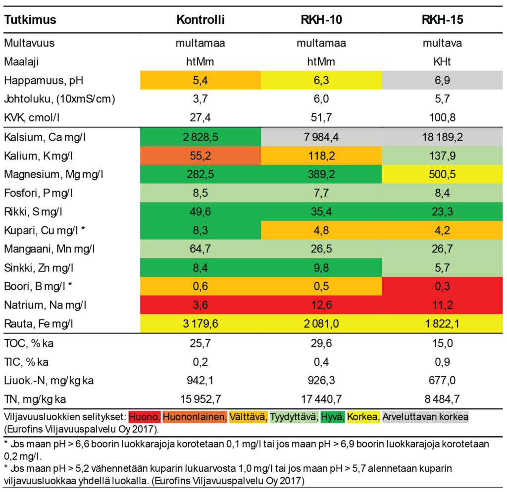 Kokeen päätteeksi otettujen maanäytteiden perusteella taulukosta 1 huomataan, että maalaji koeruutujen kontrolli sekä RKH-10 sarjassa oli hietaista multamaata, multavuudeltaan multamaata. RKH-15 sarjassa maalaji muuttui karkeaksi hiedaksi, multavuudeltaan multavaksi. Tuloksista nähdään, että pH kasvoi ilman erillistä kalkitsemista rikastushiekkalisäyksen myötä multamaille arveluttavan korkeaksi. Johtoluku kasvoi myös hieman rikastushiekkalisäyksen myötä, kuitenkaan 10 massa-%:n ja 15 massa-%:n välillä ei havaittu eroavaisuutta johtolukua tarkasteltaessa. Myös kationinvaihtokapasiteetti (KVK) kasvoi rikastushiekkapitoisuuden kasvaessa yli kolminkertaiseksi 15 massa-%:n lisäyksellä verrattuna kontrolliin.