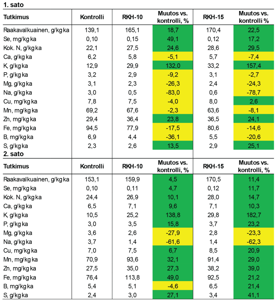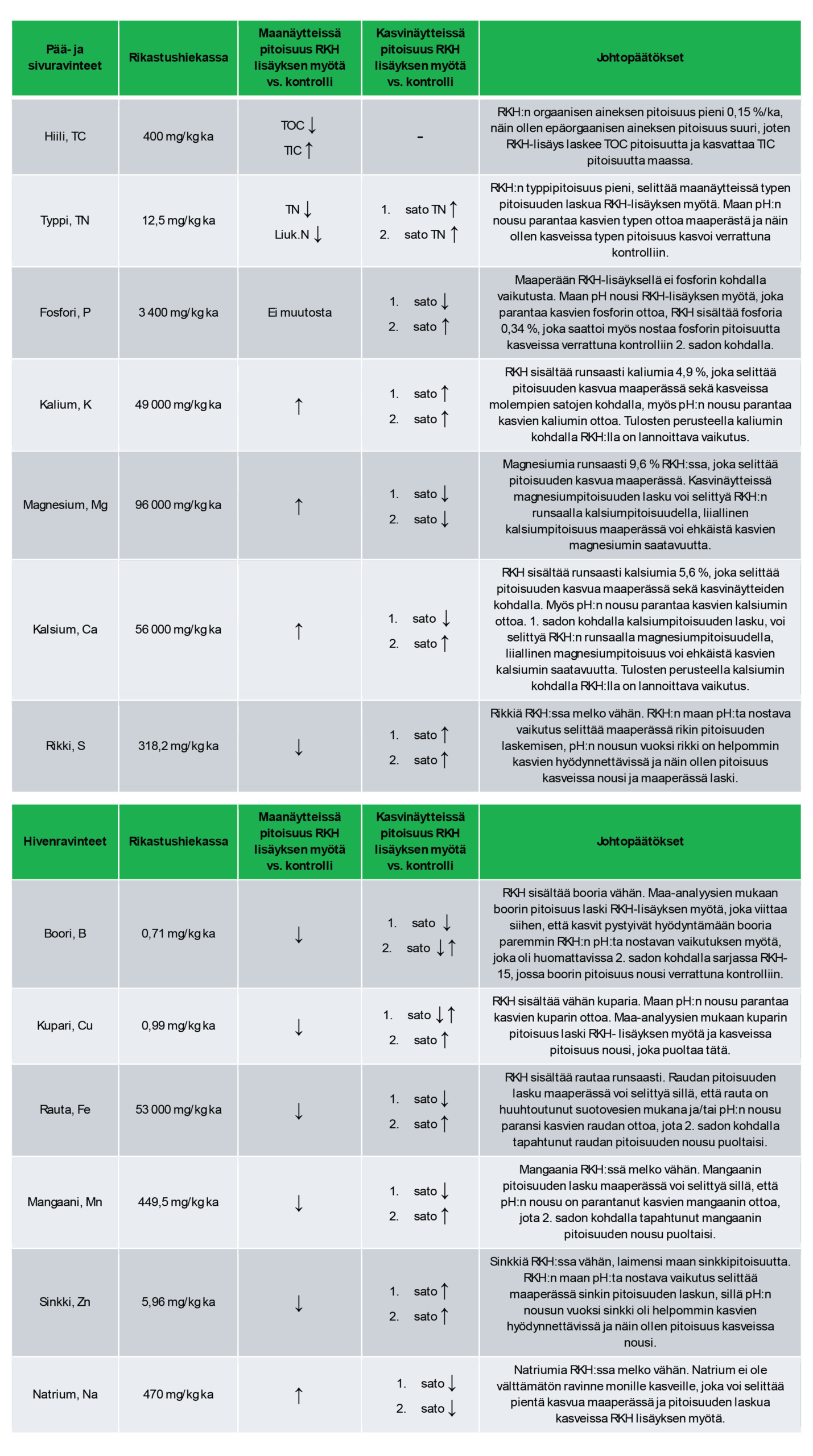 Kokonaisuudessaan kasvinäytteiden pää- sivu- ja hivenravinne pitoisuudet kasvoivat viimeistään 2. sadon kohdalla kaikkien muiden alkuaineiden osalta paitsi magnesiumin ja natriumin sekä boorin kohdalla sarjassa RKH-10 verrattaessa pitoisuuksia kontrolliin.